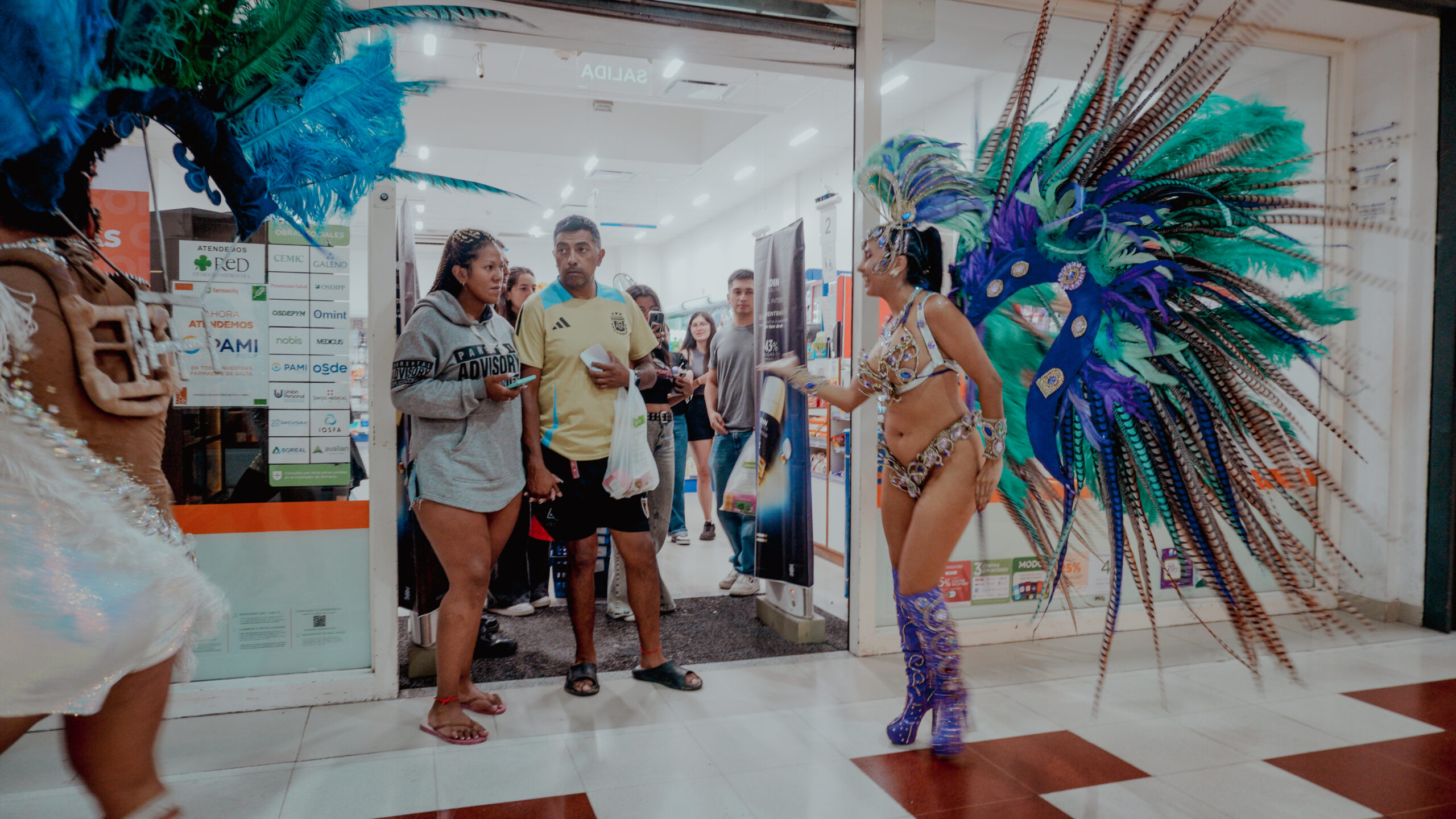 Justamente la primera salida fue en el shopping Alto Noa de Salta con la presencia de los diferentes integrantes de las comparsas “mostrando un poquito de lo que se vive cada noche en San Pedro”, explicó Franco Melano.