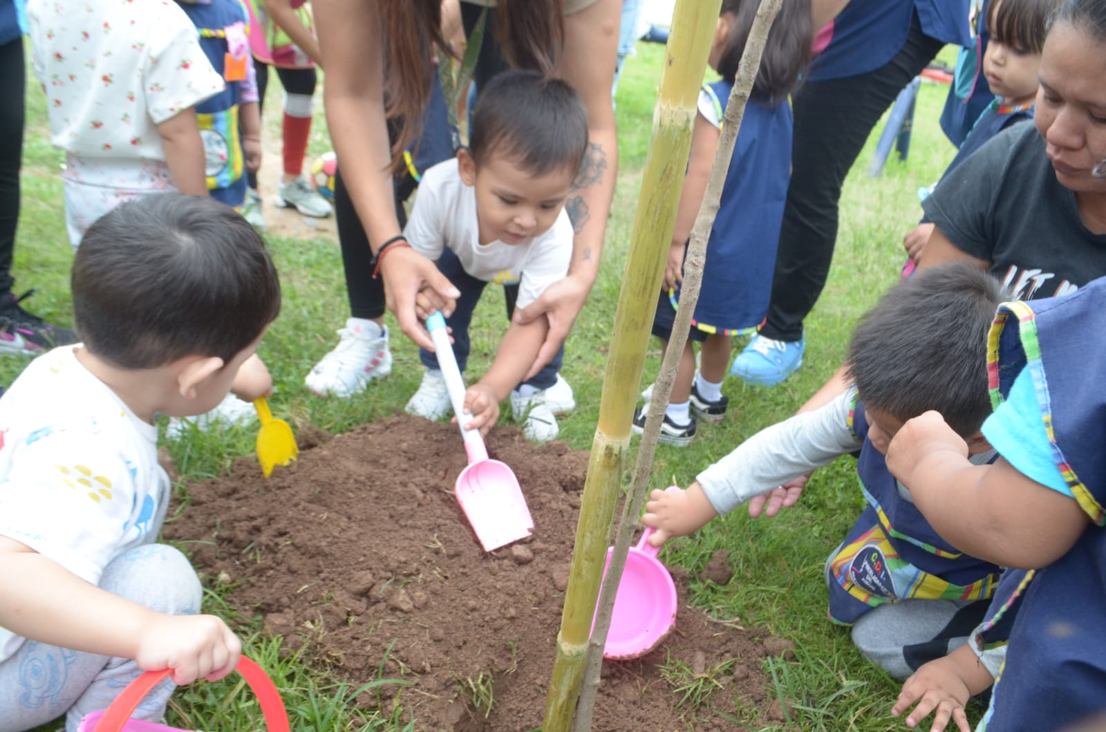 La Municipalidad de San Pedro de Jujuy que dirige el Intendente Julio Bravo, continúa con los trabajos de reforestación de espacios públicos acompañados por los estudiantes del CDI municipal “Pinceladas de Amor” en barrio La Merced.