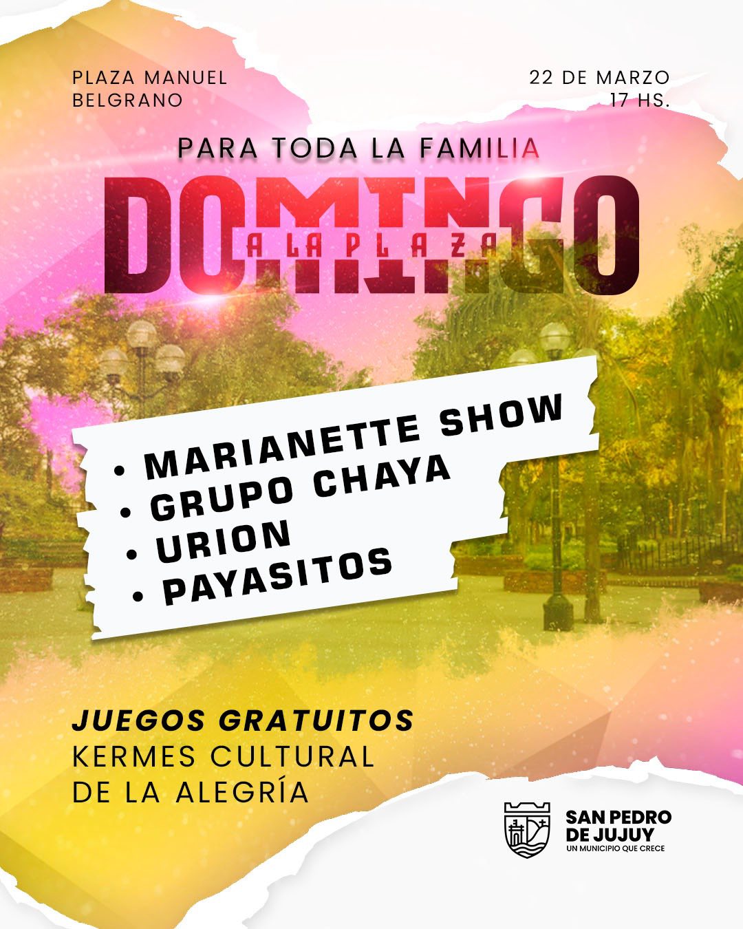 La cita será justamente este domingo desde las 17 en plaza central General Manuel Belgrano. Con muchas expectativas, se espera contar con la presencia de toda la familia sampedreña para pasar una jornada diferente, al aire libre con muchas actividades para desarrollar y sobre todo que los niños y niñas puedan divertirse.